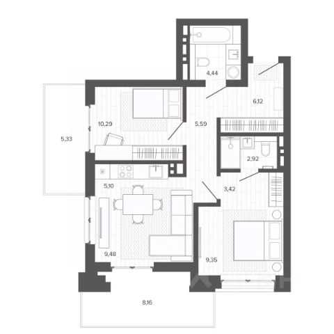 Подземная автостоянка полностью расположена под внутренним двором. На кровле предусмотрены проезды, пешеходные тротуары, зеленые насаждения, открытая стоянка для автомобилей и игровые площадки. Высота помещения автостоянки варьируется от 2,49 м до 2,84 м, а высота подвального этажа составляет 3,15 м. Высота жилых этажей с первого по восьмой - 2,9 метра. 2-комнатная квартира в новостройке в районе Октябрьский в городе Барнаул.