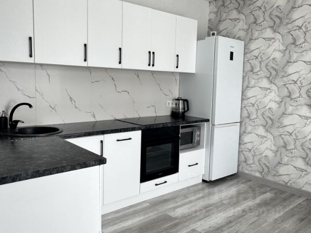 • полностью укомплектованным кухонным гарнитуром с барной стойкой и встроенной техникой (варочная панель, духовой шкаф, микроволновая печь), холодильником;