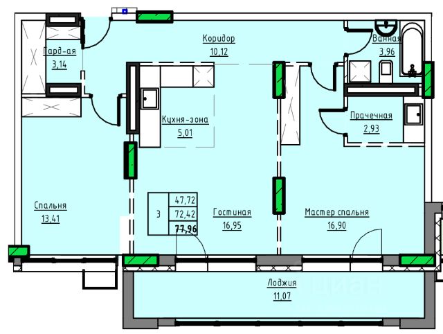 Продаётся 3-комнатная квартира в строящемся доме (Дом 1), срок сдачи: II-кв. 2029, общей площадью 78.54 кв.м., на 10 этаже. 10-ти этажный жилой дом в г. Заринске по адресу пр-т. Строителей, 29в. Проектом предлагается 3-х подъездный, 10-ти этажный жилой дом с встроенными на первом этаже помещениями общественного назначения. Исходя из ориентации дома входы в подъезды предусмотрены со стороны двора, тогда как в нежилые помещения - со стороны пр-т. Строителей. Вокруг здания предусматривается круговой проезд для автомобильного транспорта. Парковки для постоянного, временного хранения автомобилей, а также парковки для нежилых помещений предусмотрены, при этом согласно нормативам градостроительного проектирования Алтайского края от 29.12.2022 N 537, машино-мест может располагаться на прилегающей территории более 90 штук. Детские, спортивные площадки запроектированы с учетом нормативных расстояний от жилья и парковок. В жилом доме предусмотрено 222 квартир в том числе: Студии - 841-комн. - 482-х комн. - 543-х комн. - 304-х комн. - 6Имеется возможность объединения квартир для увеличения площади. Высота первого этажа - 3,6 м, жилых этажей - 3 м. В подвале предусмотрены кладовые для хранения негорючих вещей жильцов. В каждом подъезде имеется лестничная клетка и два лифта - пассажирский грузоподъемностью 400 кг и грузопассажирский грузоподъемностью 630 кг. Практически каждая квартира имеет выход на просторную застекленную лоджию площадью 6-9 кв.м. Все окна увеличенной высоты, что обеспечивает максимальное дневное освещение квартир. Часть квартир дополнительно оборудована мастер спальнями и гардеробными. Конструктивная схема монолитный железобетонный каркас с заполнением кирпичом и газобетоном с утеплителем. Облицовка 1-2 этажей клинкерным кирпичом. Выше штукатурка по стене. Окна - из металлопластика. Витражи 1-го этажа, остекления балконов - алюминиевые. Прилегающая территория к дому комплексно благоустраивается с асфальтированием проездов, озеленением и тротуарной плиткой. Площадки для игр детей и занятия спортом укомплектовываются элементами заводского изготовления. Жилой дом после строительства украсит центральную часть г. Заринска.
