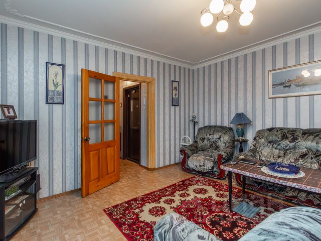Квартира расположена на улице Петра Мерлина в пятиэтажном панельном доме 1972 года постройки. Общая площадь — 59,4 кв. м, из которых 42,6 кв. м — жилая площадь. Высота потолков — 2,5 м.