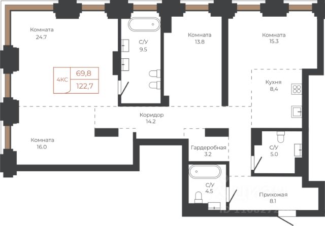 Продаётся 4-комнатная квартира в строящемся доме (Корпус 2), срок сдачи: II-кв. 2027, общей площадью 93 кв.м., на 9 этаже. ЖК "Тургенев" на ул. Чеглецова, 25а представляет из себя два кирпичных здания высотой 9 этажей.