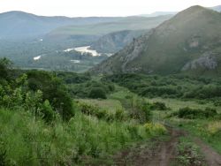 Расположен под горой, за участком сразу идёт тропа на обзорную гору...