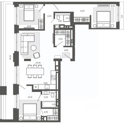 Квартира представляет собой 4 комнаты, что делает ее прекрасным вариантом для большой семьи или для тех, кто любит просторные и светлые помещения.