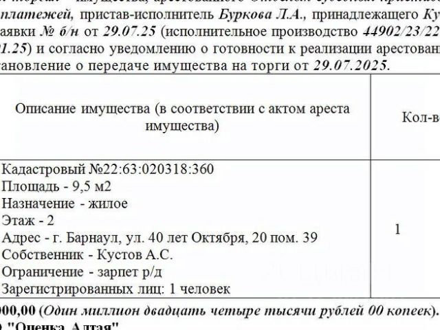 Продается уютная 2-комнатная квартира в кирпичном доме, построенном в 1961 году. Расположенная на первом этаже двухэтажного здания, она обладает площадью 40.6 кв. м, с жилой площадью 28.4 кв. м и кухней размером 4.5 кв. м. Высота потолков составляет 2.5 метра, что создает комфортное пространство для жизни. Квартира с косметическим ремонтом, что позволяет вам сразу же переехать и обустроиться по своему вкусу. В квартире есть совмещенный санузел, окна выходят во двор, обеспечивая тишину и уют. Дом находится в хорошем состоянии, благодаря кирпичному материалу постройки, который обеспечивает долговечность и теплоизоляцию. Парковка во дворе позволит вам всегда найти место для вашего автомобиля. Рядом с домом есть все необходимое для комфортной жизни: школы, детские сады, клиники и магазины. Отличная транспортная доступность позволит вам легко добраться до любой точки города. Продажа квартиры осуществляется от собственника. Все документы готовы к сделке, возможна продажа в ипотеку. Обременений и юридических проблем нет, поэтому процесс покупки будет быстрым и прозрачным. Приглашаем вас на просмотр! Записывайтесь заранее, чтобы убедиться в том, что эта квартира — именно то, что вы искали. Продам квартиру до 1,4 млн. рублей в Алтайском крае.