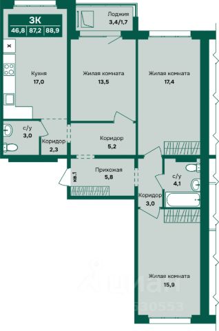 Продаётся 3-комнатная квартира в строящемся доме (Папанинцев, 155 (Блок-секция 1-2)), срок сдачи: III-кв. 2028, общей площадью 89.7 кв.м., на 3 этаже. Новый жилой комплекс "Империал" от группы компаний "Авангард" расположен по адресу: г. Барнаул, по ул. Папанинцев.