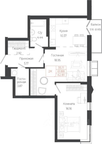 • ✅ Минимальная площадь: 34,8 м²