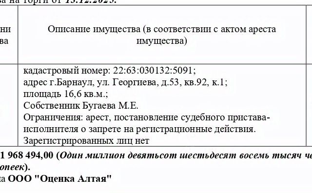 Данные получены с сайта ГИС Торги. Жилое помещение, кадастровый 22:63:030132:5091, площадь 16,6 кв.м., адрес: Алтайский край, г. Барнаул, ул. Георгиева, д. 53, кв. 92, к. 1. Зарегистрированных лиц нет. Начальная цена 1 968 494 руб. (Бугаева М.Е., арест, запрещения регистрации) (2420)