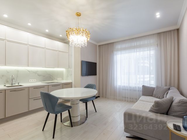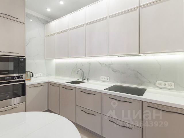 Кухонная зона оборудована гарнитуром с качественной фурнитурой и рабочей поверхностью из искусственного камня, так же имеется обеденный стол. Оставляем всю встроенную технику (холодильник, СВЧ-печь, духовой шкаф, посудомоечную машину, индукционную варочную поверхность, вытяжку). В гостевой зоне расположен качественный диван и телевизор, которые так-же остаются в квартире!