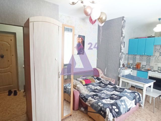 Общая площадь — 27,7 кв. м, и каждый метр здесь работает на комфорт. Главная особенность — утеплённая лоджия длиной 6 метров, которая стала не просто балконом, а настоящей дополнительной комнатой, пригодной для использования даже в холодное время года. Из комнаты на неё ведут два окна и две двери — необычное архитектурное решение, наполняющее пространство светом и воздухом.