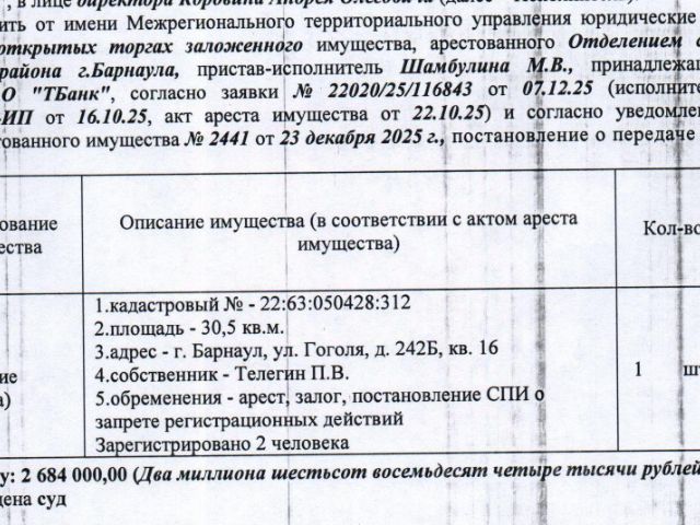 Данные получены с сайта ГИС Торги. Лот3 Жилое помещение (квартира), кадастровый 22:63:050428:312, площадь 30,5 кв.м., этаж 1, адрес: Алтайский край, г. Барнаул, ул. Гоголя, д. 242Б, кв. 16. Зарегистрированных лиц 2 чел. Информация о задолженности по взносам на капитальный ремонт СПИ не предоставлена. Начальная цена 2 281 400 руб. 00 коп. (Телегин П.В., ипотека, запреты на совершение регистрационных действий, арест) (2441) (повторные).
