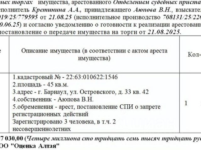 Данные получены с сайта ГИС Торги. Лот3 Жилое помещение (квартира) кадастровый - 22:63:010622:1546 площадь - 45 кв.м. адрес - г. Барнаул, ул. Островского, д. 33 кв. 42. Зарегистрировано 3 человека, в т.ч. 2 несовершеннолетних. Нач.цена 4137030 руб. (Аюпова В.Н., арест, постановление СПИ о запрете регистрационных действий ) (1483)