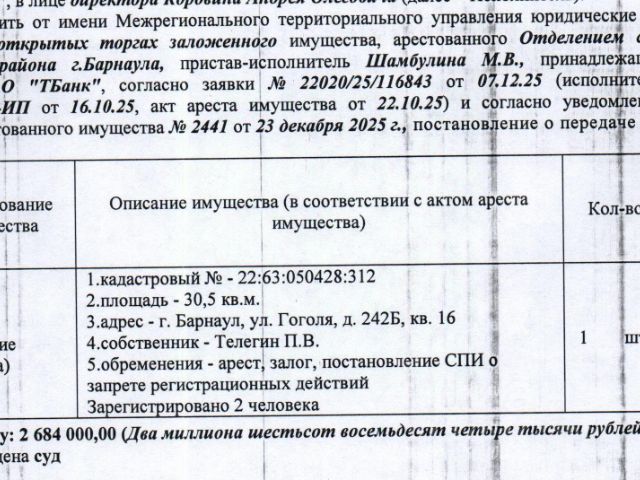 Продаётся 1-комнатная квартира в центре Барнаула Отличный вариант для проживания или аренды! Расположение: Дом находится в тихом районе в самом центре города. Рядом всё необходимое: школы, детские сады, магазины, аптеки, остановки общественного транспорта, поликлиника. До главных улиц — 2-7 минут пешком. Удобная транспортная развязка, можно быстро добраться в любую часть города. О доме: Кирпичная хрущёвка, тёплая, с хорошей шумоизоляцией. 3 этаж из 5 — оптимальный вариант по высоте. Спокойные соседи, двор с парковкой. О квартире: — Общая площадь — около 30 м² — Комната просторная и светлая — Большое окно, приятный вид во двор — Установлены пластиковые окна — Квартира сухая и тёплая Преимущества: Центр города Удобная планировка Средний этаж Кирпичный дом Хорошее состояние Без обременений Один взрослый собственник