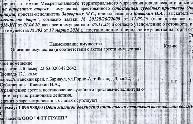 Данные получены с сайта ГИС Торги. Лот7 Жилое помещение (комната), кадастровый 22:63:020347:2642, площадь 12,1 кв.м., этаж 1, адрес: Алтайский край, г. Барнаул, ул. Горно-Алтайская, д. 3, кв. 22, ком. 1. Информация о зарегистрированных лицах и о задолженности по взносам на капитальный ремонт СПИ не предоставлена. Начальная цена 1 095 988 руб. 00 коп. (Клевакин Н.А., запреты на совершение регистрационных действий, арест) (393).