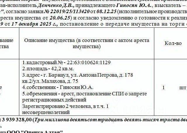 Данные получены с сайта ГИС Торги. Лот6 Жилое помещение (квартира) 1.кадастровый - 22:63:010624:1129 площадь - 42,2 кв.м. адрес - г. Барнаул, ул. Антона Петрова, д. 178 кв.2/ул. Малахова, д. 75. Зарегистрировано 2 человека, в т.ч. 1 несовершенолетний. Нач.цена 3348428руб. 80 коп. (Гиносян Ю.А., обременения - арест, постановление СПИ о запрете регистрационных действий) (2349) (повторные)