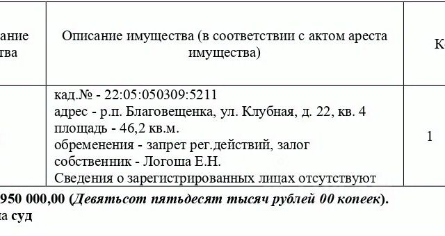 Данные получены с сайта ГИС Торги. Жилое помещение (квартира), кадастровый 22:05:050309:5211, площадь 46,2 кв.м., адрес: Алтайский край, Благовещенский район, р.п. Благовещенка, ул. Клубная, д. 22, кв. 4. Начальная цена 950 000 руб. (Логоша Е.Н., ипотека, запрещение регистрации) (2611)