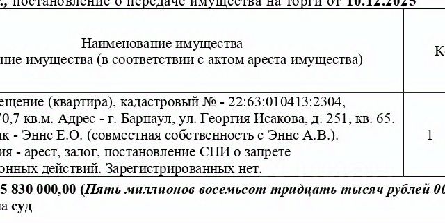 Данные получены с сайта ГИС Торги. Жилое помещение (квартира), кадастровый 22:63:010413:2304, площадь 70,7 кв.м., адрес: Алтайский край, г. Барнаул, ул. Георгия Исакова, д. 251, кв. 65. Зарегистрированных нет. Начальная цена 4 955 500 руб. (Эннс Е.О. (совместная собственность с Эннс А.В.), ипотека, арест, запрещения регистрации) (2329) (повторные)