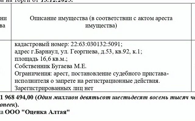 Данные получены с сайта ГИС Торги. Жилое помещение, кадастровый 22:63:030132:5091, площадь 16,6 кв.м., адрес: Алтайский край, г. Барнаул, ул. Георгиева, д. 53, кв. 92, к. 1. Зарегистрированных лиц нет. Начальная цена 1 673 219,90 руб. (Бугаева М.Е., арест, запрещения регистрации) (2420) (повторные)