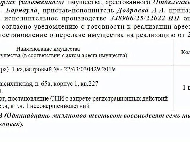 Данные получены с сайта ГИС Торги. Лот7 Жилое помещение (квартира), кадастровый 22:63:030319:408, площадь 29,5 кв.м., этаж 11, адрес: Алтайский край, г. Барнаул, ул. Балтийская, д. 95, кв. 315. Зарегистрированных лиц 5 чел., из них несовершеннолетних 1 чел. Информация о задолженности по взносам на капитальный ремонт СПИ не предоставлена. Начальная цена 1 500 000 руб. 00 коп. (Грошева И.В., ипотека, запреты на совершение регистрационных действий, арест) (75).