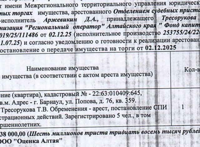 Данные получены с сайта ГИС Торги. Лот6 Жилое помещение (квартира), кадастровый 22:66:010203:1228, площадь 29,8 кв.м., этаж 5, адрес: Алтайский край, г. Заринск, ул. Союза Республик, д. 2/1, кв. 158. Зарегистрированных лиц 3 чел., из них несовершеннолетних 1 чел. Информация о задолженности по взносам на капитальный ремонт СПИ не предоставлена. Начальная цена 2 083 000 руб. 00 коп. (Петухова Л.В. (общая долевая собственность с Солдатовой В.В.), ипотека, запреты на совершение регистрационных действий, арест) (14).