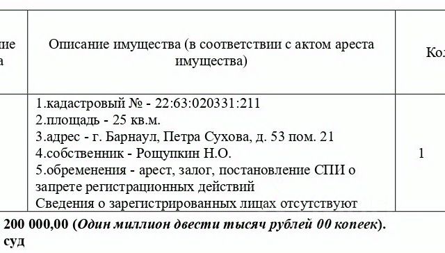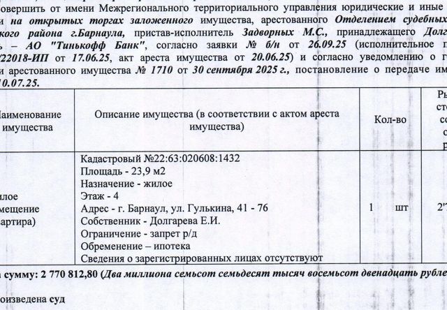 Данные получены с сайта ГИС Торги. Лот1 Жилое помещение (квартира), кадастровый 22:63:020608:1432, площадь 23,9 кв.м., этаж 4, адрес: Алтайский край, г. Барнаул, ул. Гулькина, д. 41, кв. 76. Информация о зарегистрированных лицах и о задолженности по взносам на капитальный ремонт СПИ не предоставлена. Начальная цена 2 355 190 руб. 88 коп. (Долгарева Е.И., ипотека, запреты на совершение регистрационных действий) (1710) (повторные).