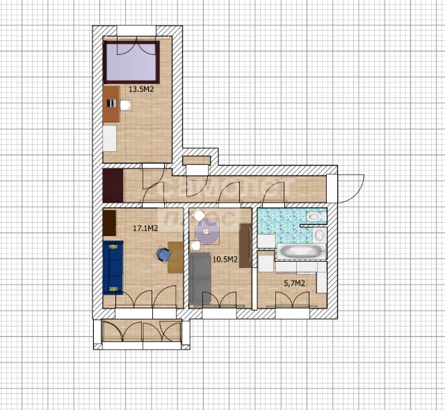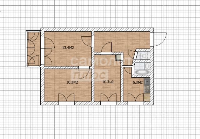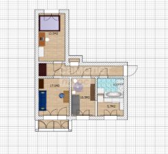 Площади помещений (м.кв.): коридор 10,4; санузел (совмещенный)- 5,1; кухня- 12,5; спальня- 17,9; зал- 14,2; лоджия- 1,9.