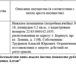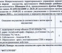 Лот7 Нежилое помещение в жилом доме, кадастровый 22:63:020426:710, площадь 74,3 кв.м., этаж 1, адрес: Алтайский край, г. Барнаул, ул. Степная 1-я, д. 4. Начальная цена 4 842 809 руб. 00 коп. (Асадчев Ю.В., запреты на совершени...