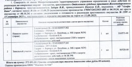 Лот8 Нежилое здание (гараж), 1991 г.п., кадастровый 22:63:020517:302, площадь 19,8 кв.м., количество этажей 1, и земельный участок, назначение земли населенных пунктов под размещение гаражей для собственных нужд, кадастровый...