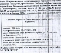 Лот4 Земельный участок, назначение земли населенных пунктов под индивидуальное жилищное строительство, кадастровый 22:47:190234:870, площадь 712 кв.м., адрес: Алтайский край, Тальменский район, р.п. Тальменка, ул. Залесовская,...