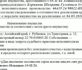 Лот4 Нежилое здание по адресу: Алтайский край, г. Рубцовск, ул Тракторная, д. 13, площадь: 234.5 кв.м., кадастровый номер 22:70:010803:28. Нач.цена 2646100 руб. (Должник Керимова ШГО, Собственник — Керимов Ш.Г. Ограничение в в...
