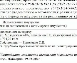 Нежилое помещение (погребная ячейка), кадастровый 22:63:040413:295, площадь 3,4 кв.м., адрес: Алтайский край, г. Барнаул, ул. Деповская, д. 4В. Начальная цена 79 549,80 руб. (Трояновская Л.А., арест, запрещения регистрации) (45...