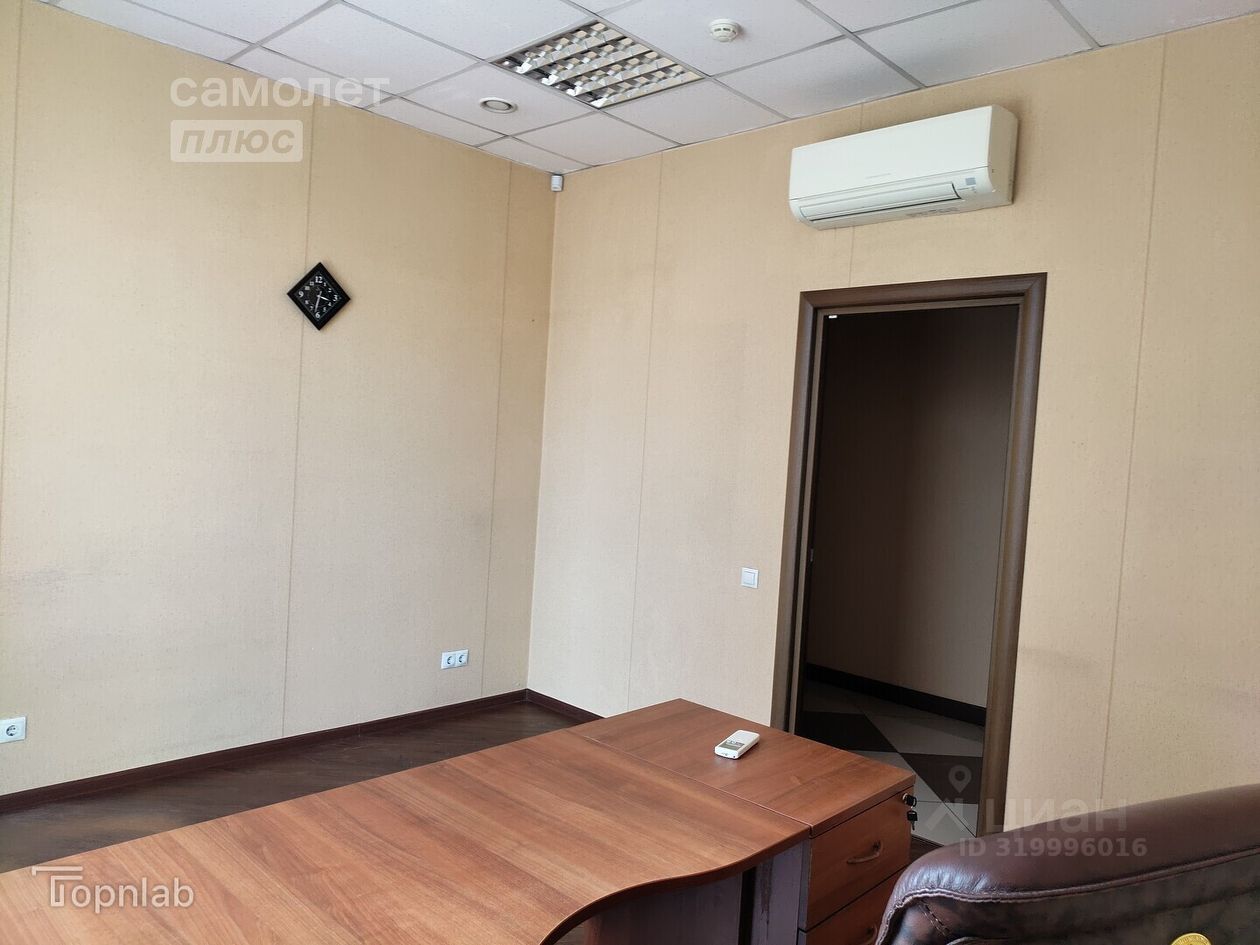 Есть стола, кресло, шкаф, кондиционер, на окнах жалюзи.