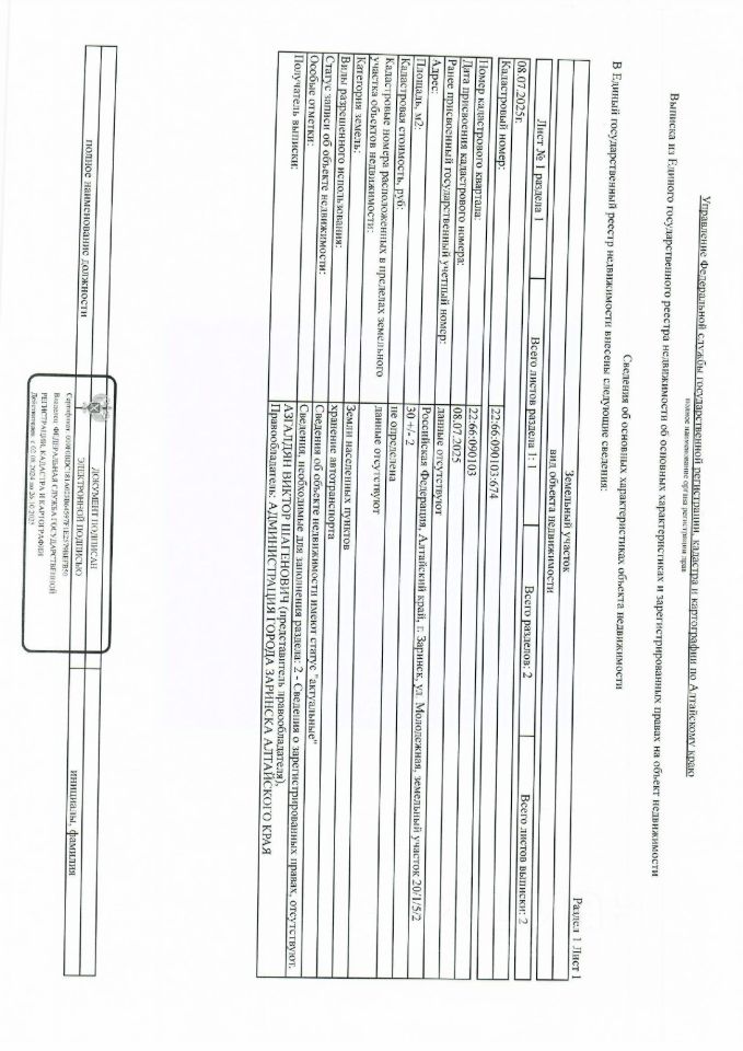 Земельный участок из земель населенных пунктов общей площадью 30 кв.м., расположенный по адресу: Российская Федерация, Алтайский край, Городской Округ город Заринск, город Заринск, ул. Молодежная, 20/1/5/2