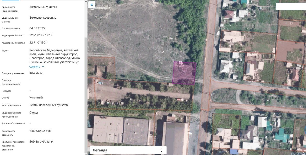 земельный участок с кадастровым номером 22:71:011501:612, общая площадь 484 кв.м., расположенный по адресу: Алтайский край, г. Славгород, ул. Пушкина, земельный участок 120/3