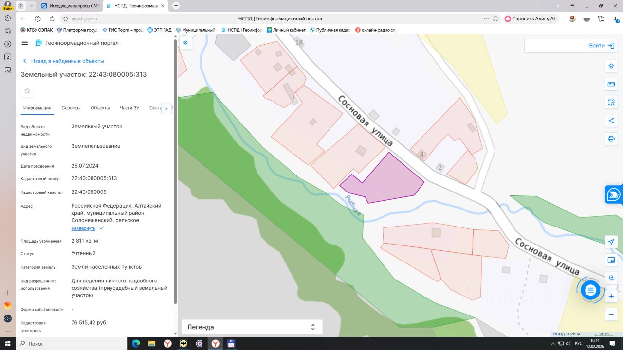 земельный участок с кадастровым номером 22:43:080005:313. Адрес: Российская Федерация, Алтайский край, муниципальный район Солонешенский, сельское поселение Тополинский сельсовет, село Рыбное, улица Сосновая, земельный участок 15. Категория земель: земли населенных пунктов. Виды разрешенного использования: для ведения личного подсобного хозяйства (приусадебный земельный участок). Площадь: 2811 кв.м. Срок аренды 20 лет
