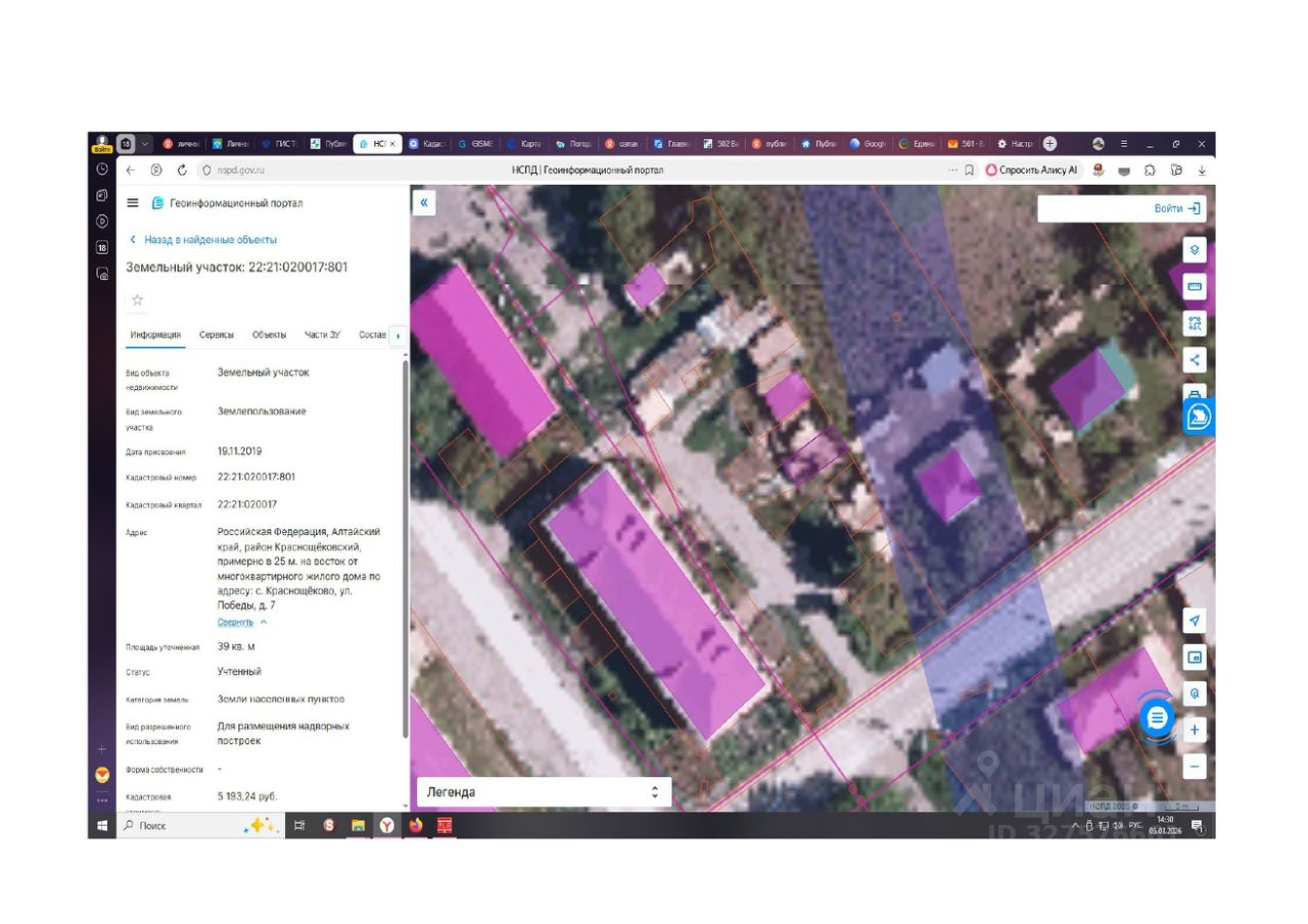 Земельный участок с кадастровым номером 22:21:020017:801 площадь 39 по адресу Российская Федерация, Алтайский край, район Краснощёковский, примерно в 25 м. на восток от многоквартирного жилого дома по адресу: с. Краснощёково, ул. Победы, д. 7