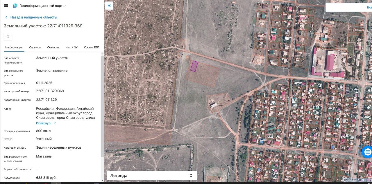 Земельный участок с кадастровым номером 22:71:011329:369 площадь 800 по адресу Российская Федерация, Алтайский край, муниципальный округ город Славгород, город Славгород, улица 1-я Складская, земельный участок 218/3