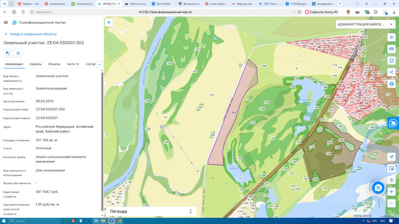 Земельный участок из земель сельскохозяйственного назначения общей площадью 301106 кв. м, с кадастровым номером 22:04:550001:302, расположенного по адресу: Местоположение установлено относительно ориентира, расположенного за пределами участка. Ориентир пос. Усть-Катунь. Участок находится примерно в 2 км, по направлению на юго-запад от ориентира. Почтовый адрес ориентира: Российская Федерация, Алтайский край, Бийский район, вид разрешенного использования для сенокошения.