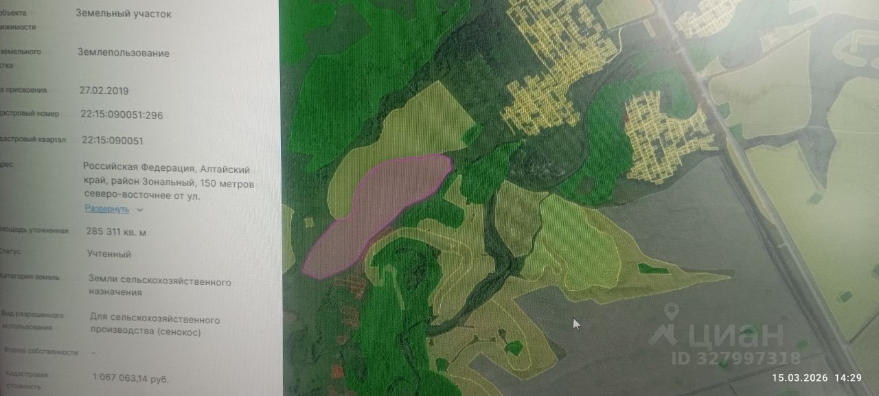земельный участок из земель сельскохозяйственного назначения, площадью 285311 кв. м, с кадастровым номером 22:15:090051:296, местоположение: Российская Федерация, Алтайский край, район Зональный, 150 метров северо-восточнее от ул. Первомайская, с. Новая Чемровка, вид разрешенного использования: сенокошение, сроком аренды: 5 (Пять) лет