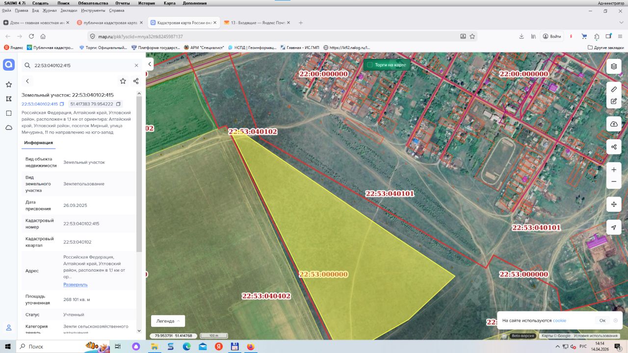 Земельный участок, государственная собственность на который не разграничена, площадью 268101 кв.м, с кадастровым номером 22:53:040102:415, расположенный по адресу: Российская Федерация, Алтайский край, Угловский район, расположен в 1,1 км от ориентира: Алтайский край, Угловский район, п. Мирный, ул. Мичурина 11 по направлению на юго-запад. Цель предоставления земельного участка для использования в целях соответствующих видам разрешенного использования - овощеводство. Разрешенное использование земельного участка овощеводство. Категория земель земли сельскохозяйственного назначения. Срок аренды 10 лет.