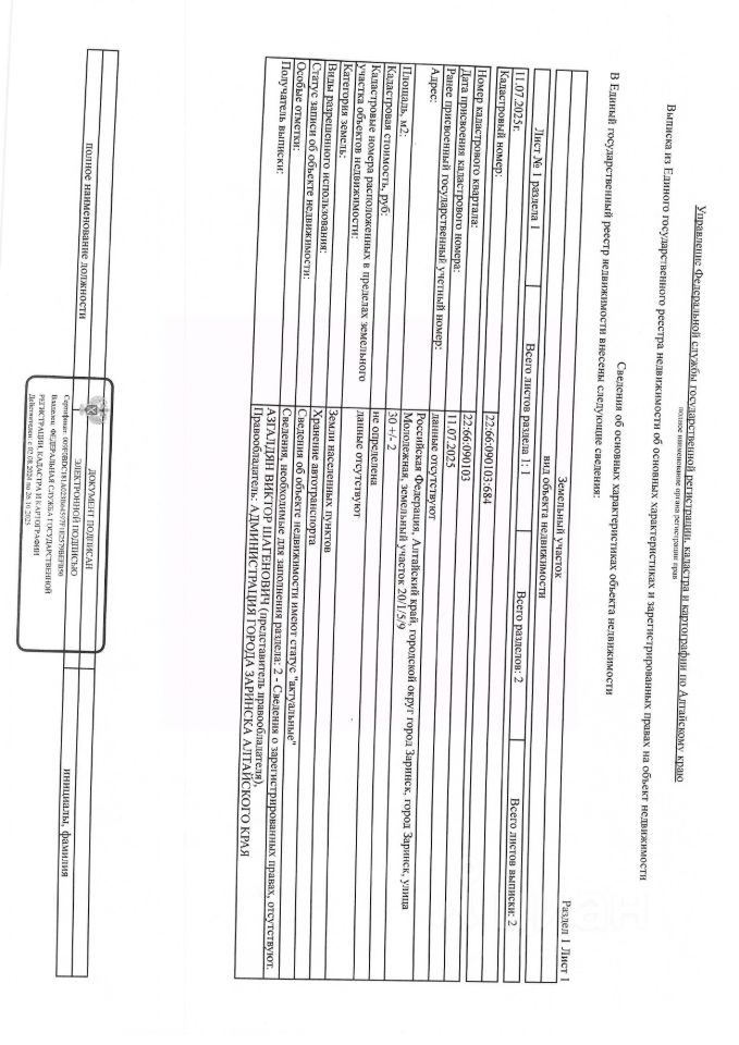 Земельный участок из земель населенных пунктов общей площадью 30 кв.м., расположенный по адресу: Российская Федерация, Алтайский край, Городской Округ город Заринск, город Заринск, ул. Молодежная, 20/1/5/9