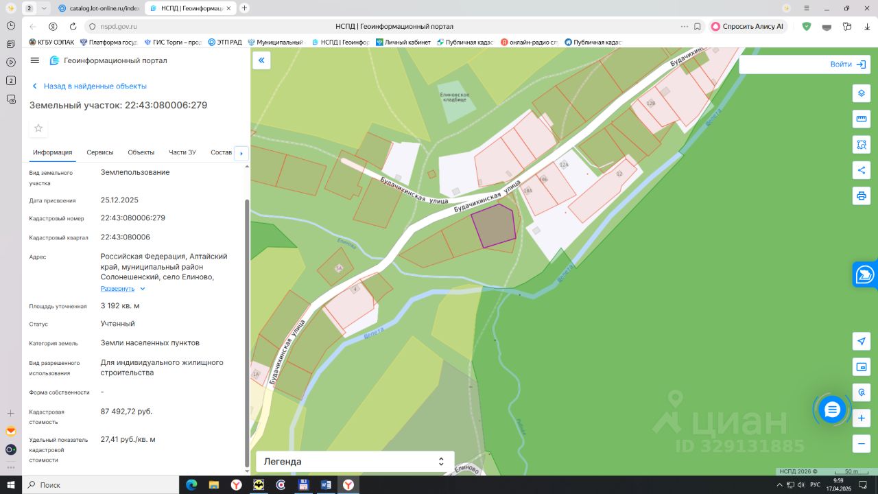 ЛОТ 1 - земельный участок с кадастровым номером 22:43:080006:279. Местоположение: Российская Федерация, Алтайский край, муниципальный район Солонешенский, село Елиново, улица Будачихинская. Площадь: 3192 кв.м. Категория земель: земли населенных пунктов. Виды разрешенного использования: для индивидуального жилищного строительства. Срок аренды 20 лет