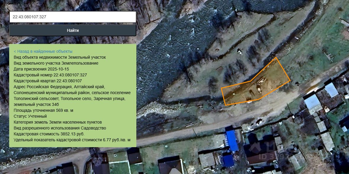 Земельный участок с кадастровым номером 22:43:080107:327. Адрес: Российская Федерация, Алтайский край, Солонешенский муниципальный район, сельское поселение Тополинский сельсовет, Топольное село, Заречная улица, земельный участок 34б. Площадь: 569 кв.м. Категория земель: земли населенных пунктов. Виды разрешенного использования: Садоводство. Срок аренды до 49 лет
