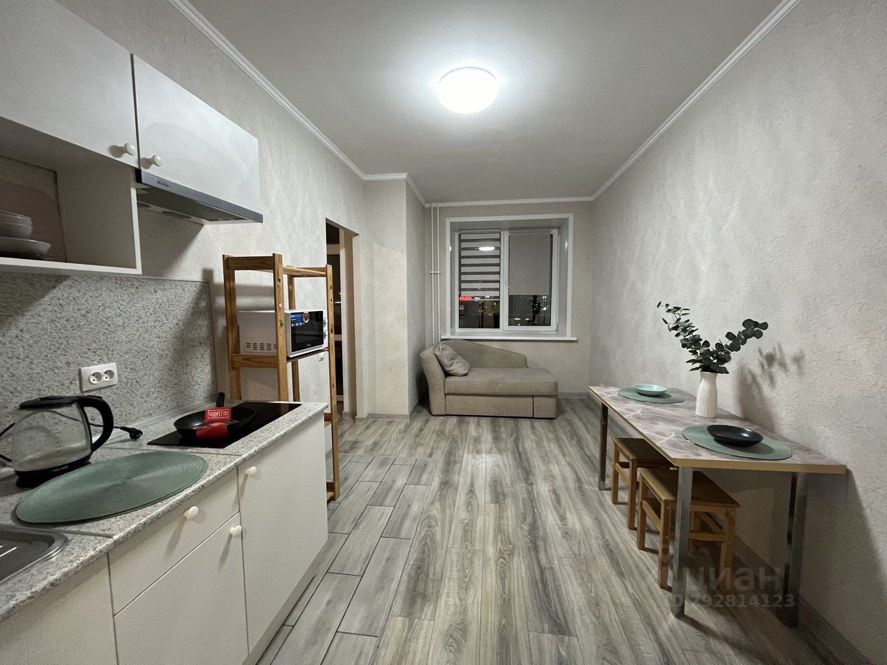 Квартира интересно перепланирована в кухню-студию с отдельной спальной зоной комнаты (кровать 160*200 с ортопедическим матрасом).