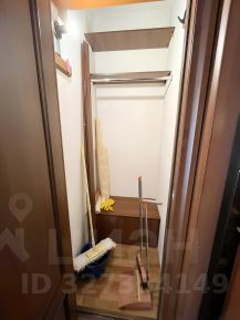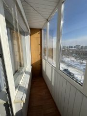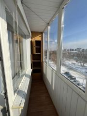 Балкон застеклен, оборудован жалюзи и встроенным шкафом.