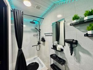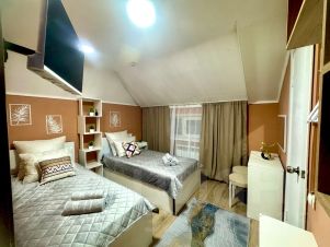 - 4 гостевые студии, каждая со своим санузлом, туалетом и душем — приватность и удобство для каждого гостя, гостевые студии вмещают 8 человек. В холле раскладной диван на 2 человека.