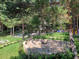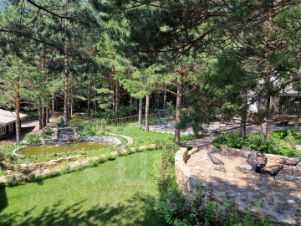 - Практически на всей территории выполнен ландшафтный дизайн, высажены газоны, кусты, яблони и груши, оборудована зона отдыха с костровищем, выложены тропинки из натурального камня