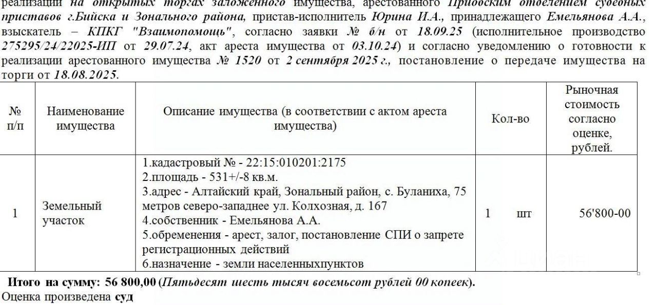 Лот2 Земельный участок, кад. 22:15:010201:2175, S-531+/-8 кв.м., адрес: АК, Зональный р-н, с. Буланиха, 75 метров северо-западнее ул. Колхозная, д. 167. Нач. цена 56800 руб. (Емельянова А.А., арест, залог, постановление СПИ о запрете р/д) (1520)