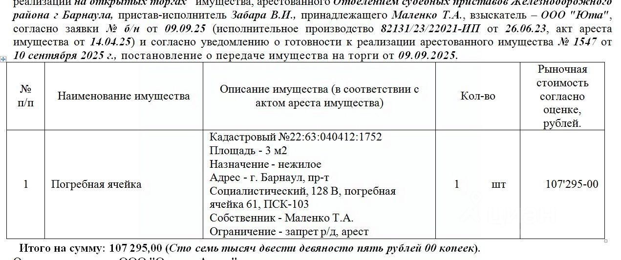 Лот3 Погребная ячейка Кадастровый 22:63:040412:1752 Площадь - 3 м2 Назначение - нежилое Адрес - г. Барнаул, пр-т Социалистический, 128 В, погребная ячейка 61, ПСК-103. Нач.цена 107295 руб. (Маленко Т.А, запрет на р/д) (1547)