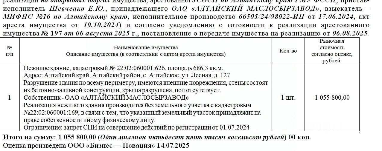 Лот6 Нежилое здание, кадастровый 22:02:060001:626, площадь 686,3 кв.м.Адрес: Алтайский край, Алтайский район, с. Алтайское, ул. Лесная, д. 127 Разрушение здания по всему периметру, имеются внешние повреждения, стены состоят из бетонно-заливной конструкции, крыша разрушена, пол отсутствует.Реализация нежилого здания производится без земельного участка с кадастровым 22:02:060001:169, в связи с тем, что указанный земельный участок принадлежит на праве собственности иному физическому лицу. Нач.цена 897430 руб. (ОАО "АЛТАЙСКИЙ МАСЛОСЫРЗАВОД, СПИ на совершение действий по регистрации от 01.07.2024) (197) (повторные)