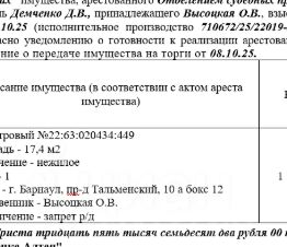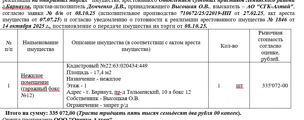 Лот4 Нежилое помещение (гаражный бокс 12) Кадастровый 22:63:020434:449 Площадь - 17,4 м2 Назначение - нежилое Этаж 1 Адрес - г. Барнаул, пр-д Тальменский, 10 а бокс 12. Нач.цена 335072 руб. (Высоцкая О.В., ограничение - запрет р/д) (1846)